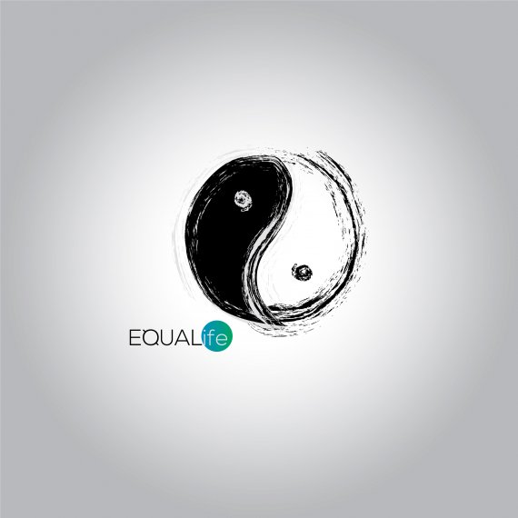 the smudging on the symbol turns it from yin and yang to nipples...which may be what you're aiming for, but without any idea of what it is supposed to represent, we can't tall. You also have two other elements going on, the double tails on the Q make it look like part of an O with a slash through it, which suggests not equal. I also don't get the teal circle around "ife."