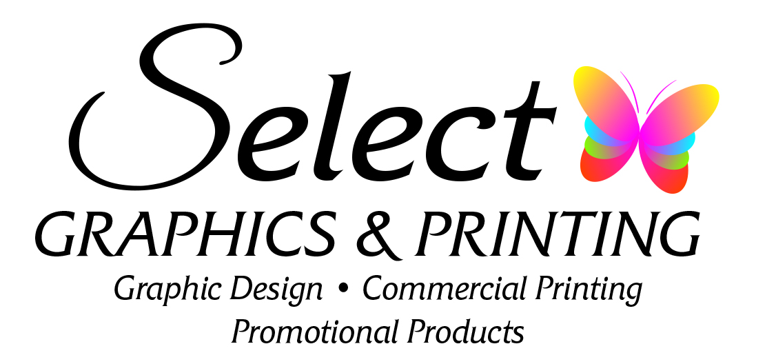 leave only select and the butterfly for the logo, maybe "graphics and printing" as subtext. "Select" goes for elegant, but the font should also bring some fresh air in it, after all is graphic, promotional and comercial- things we want to be fresh and elegant. In this case "select" is not really what i feel, go with something bold, agressive, solid, but make a lot of room for it, like an elephant dancing in a field of flowers. I like the butterfly, it looks good.