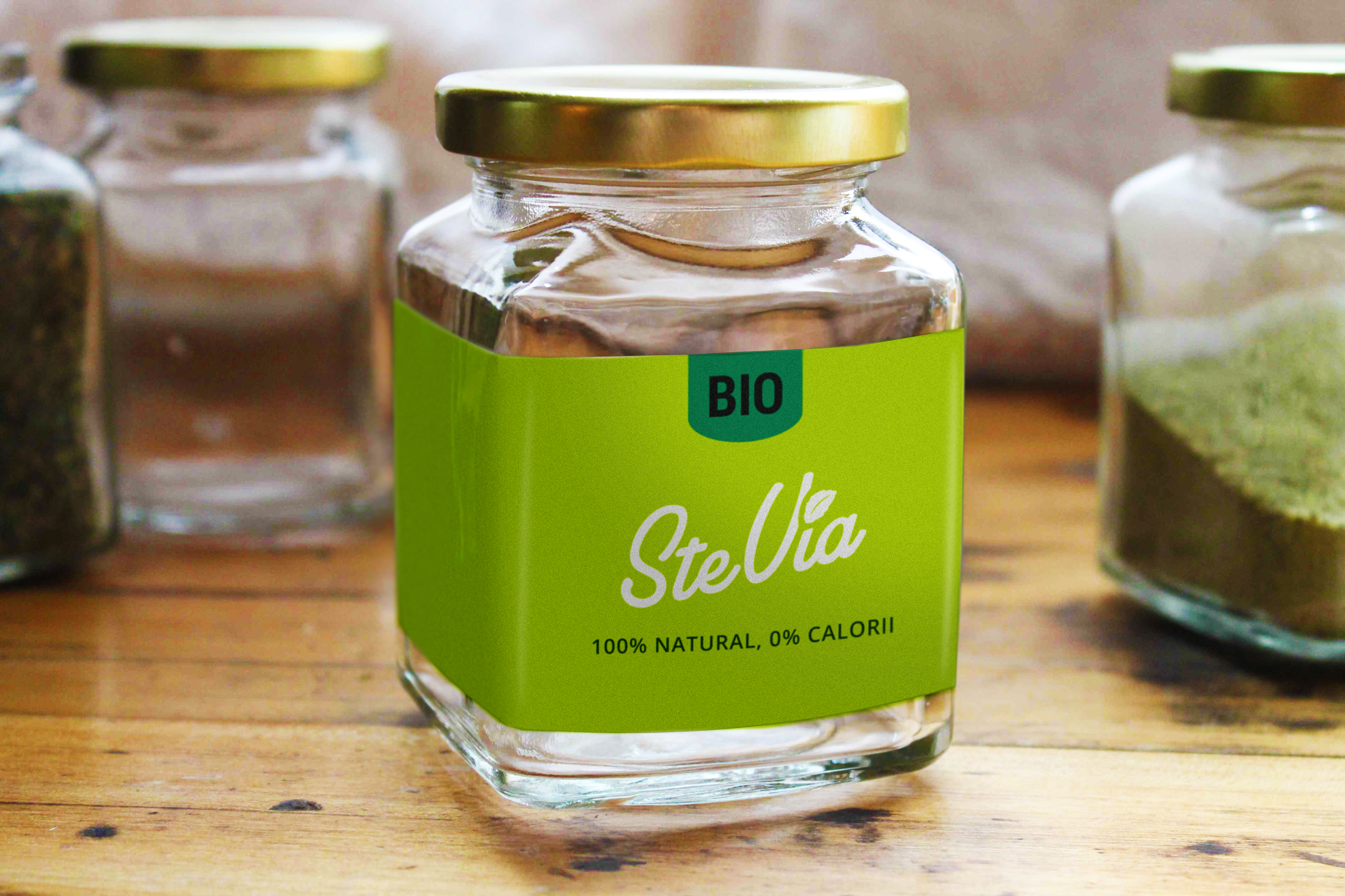 Product: 100% natural sweetner, calories free, made from stevia rebaudiana (a plant) leaves.